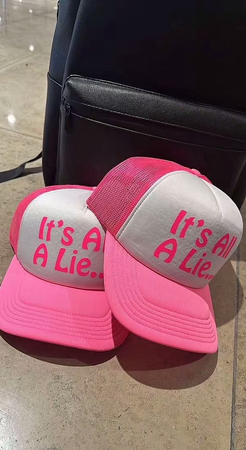 This eye-catching cap features a classic trucker design with a breathable mesh back for ultimate comfort. The phrase "It's All A Lie..." is boldly displayed in matching pink lettering, creating a seamless and stylish look.